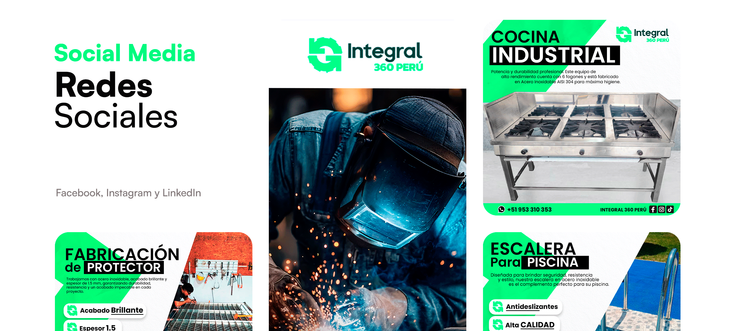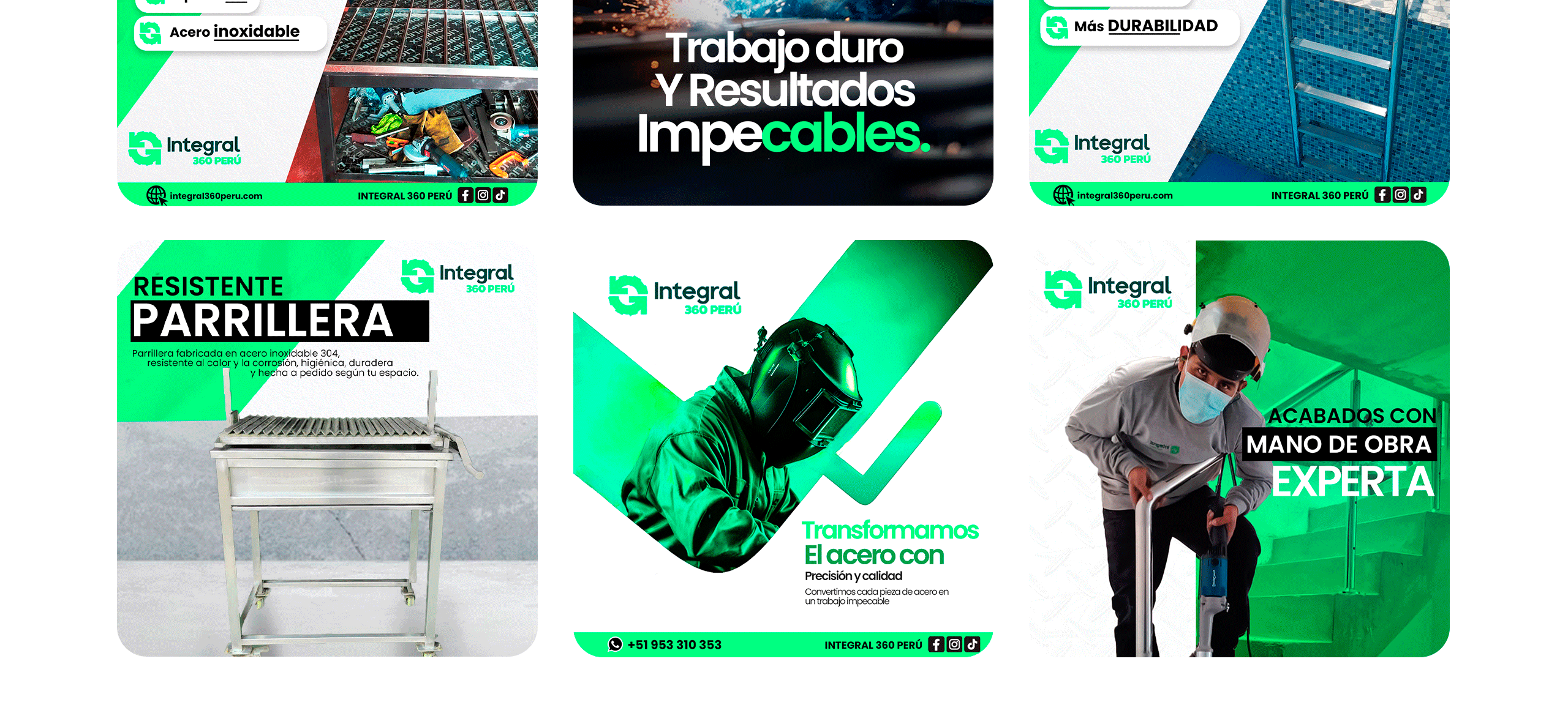 A partir del desarrollo de copys, guiones breves, videos informativos y piezas de demostración, se construyó una línea visual sólida y reconocible para INTEGRAL 360. La dirección creativa se enfocó en mostrar el proceso y el resultado final: tomas de trabajo en taller, detalles de acabados, planos cerrados del acero 304 y comparativas visuales que refuerzan calidad y durabilidad. El contenido audiovisual fue diseñado para redes sociales, web y presentaciones comerciales, priorizando claridad visual, impacto y percepción de alto nivel.